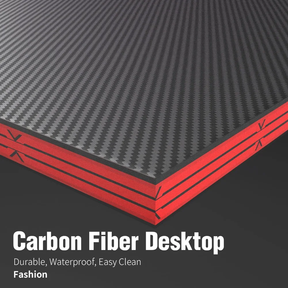 • Super Gaming Style: The amazing carbon fiber material covers the desk, even including the bottom baffle, which makes the whole table full of fabulous gloss and delicate touch. Plus the detail dark red pattern mezzanine and unique Z shaped chair legs. Bring you the double enjoyment of vision and touch.